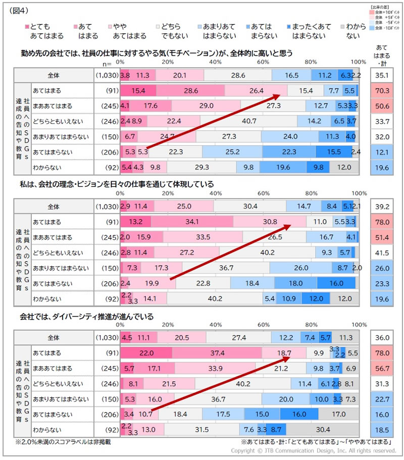 社員へのSDGs達成の告知や教育(「勤め先の会社では、社員に対して、SDGs達成の意識を高めるような告知や教育などの活動を行っている」)が実践されているほど、社員のモチベーション(「勤め先の会社では、社員の仕事に対するやる気(モチベーション)が、全体的に高いと思う」)も比例して高くなっています。